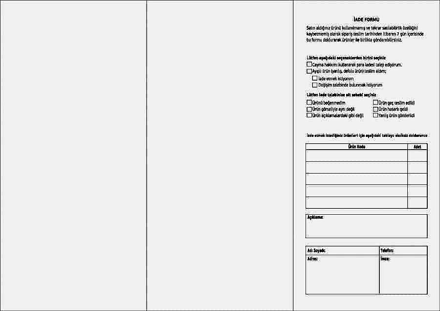E-Ticaret firmaları için iade formu kullanımları yeni yasalar gereğince zorunlu hale getirilmiştir. Bu formları isteğe bağlı olarak faturanın arka tarafına basım yapmak sureti ile eklemek mümkündür. Gerekli bilgiler faturanın arka tarafına basılarak herhangi bir iade durumunda fatura ve iade formunun tek belge halinde ürünle birlikte size ulaşması yeterli olmaktadır. Bu durum hem evrak azlığı hemde iş kolaylığını beraberinde getirmektedir.