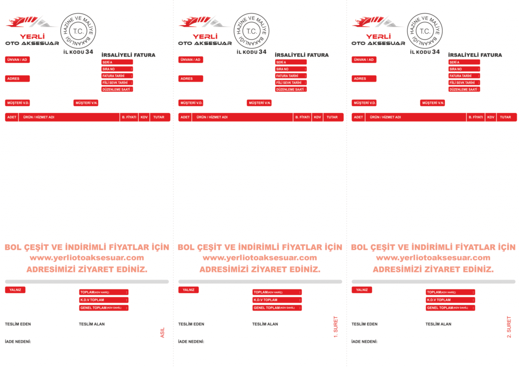 E-Ticaret firmalarında kullanılan fatura türü olan ve a4’te 2,3 veya 4 nüsha olarak bulunan fatura türleri resmi bir evraktır. Bu evraklar sadece maliye bakanlığı tarafından yetkilendirilmiş anlaşmalı matbaa firmaları tarafından basılabilmektedir.