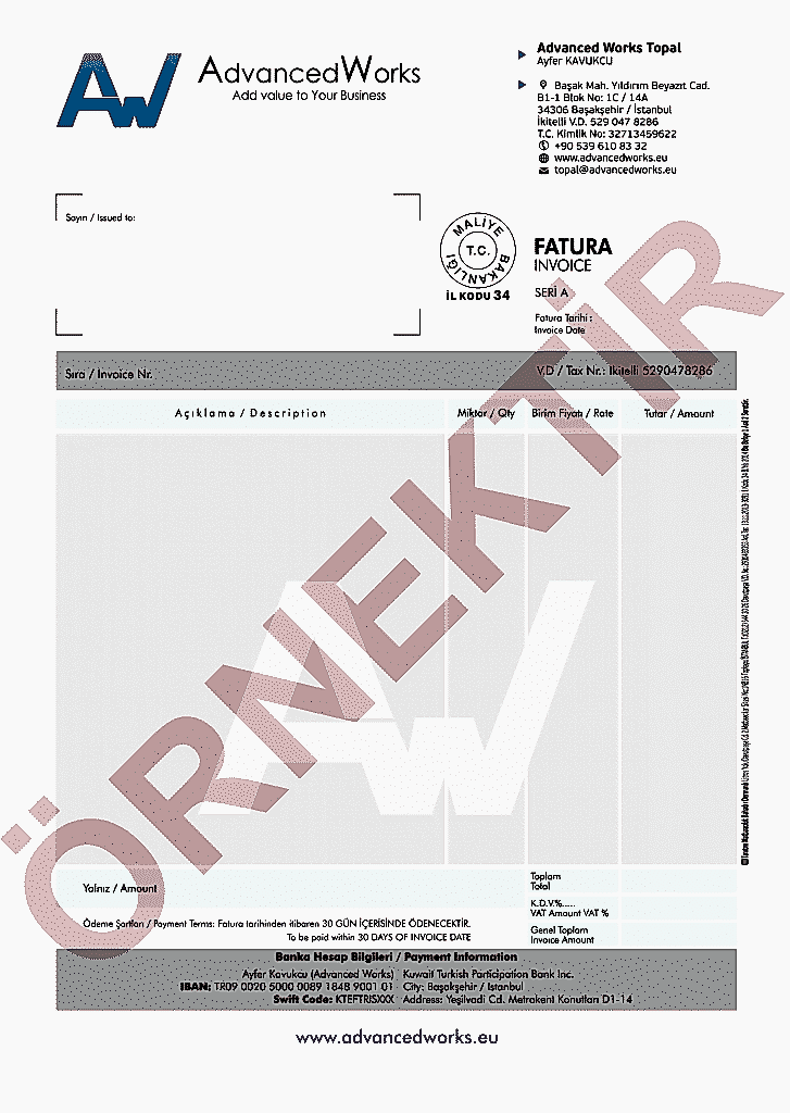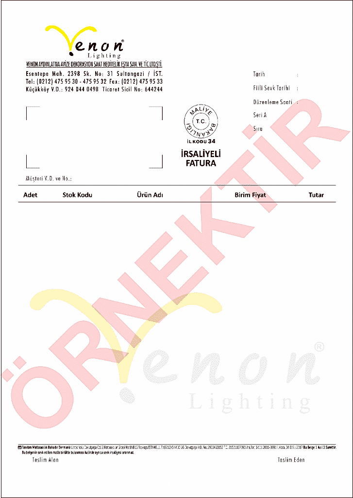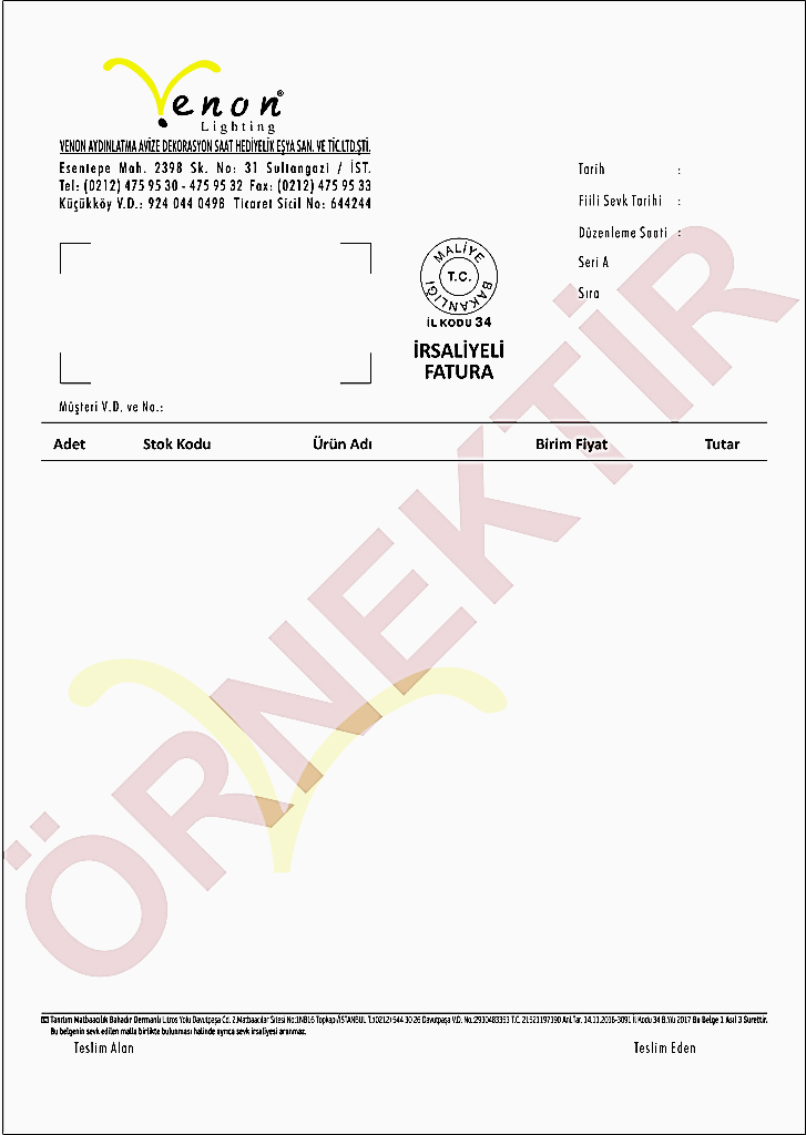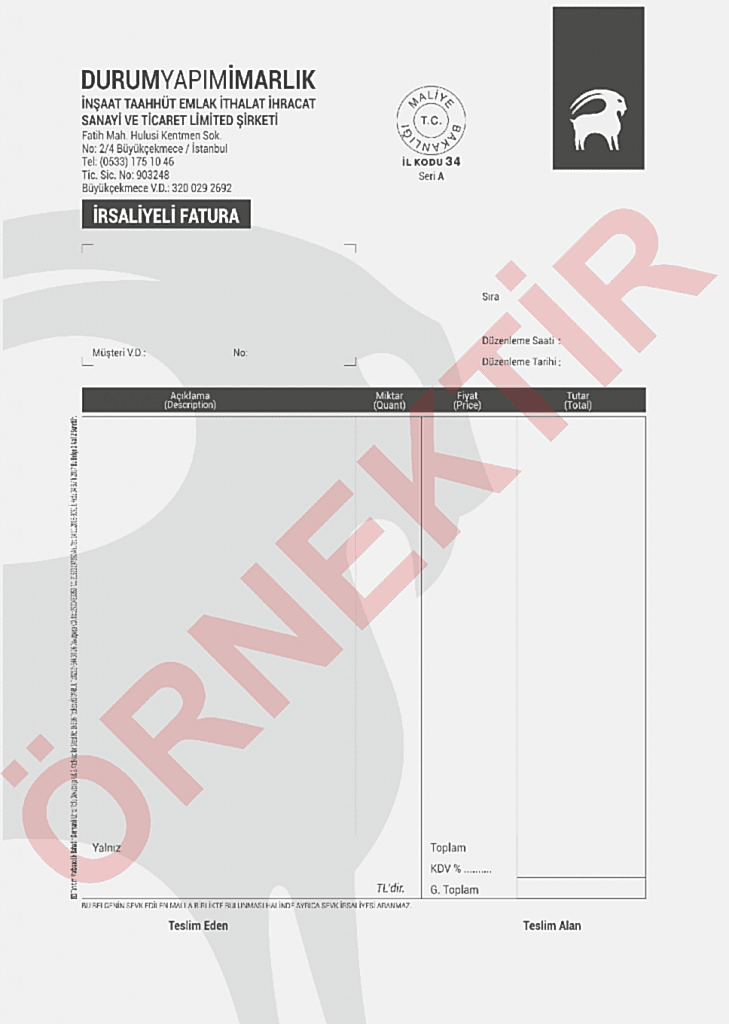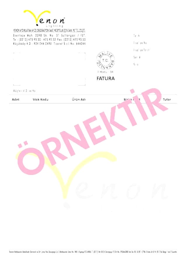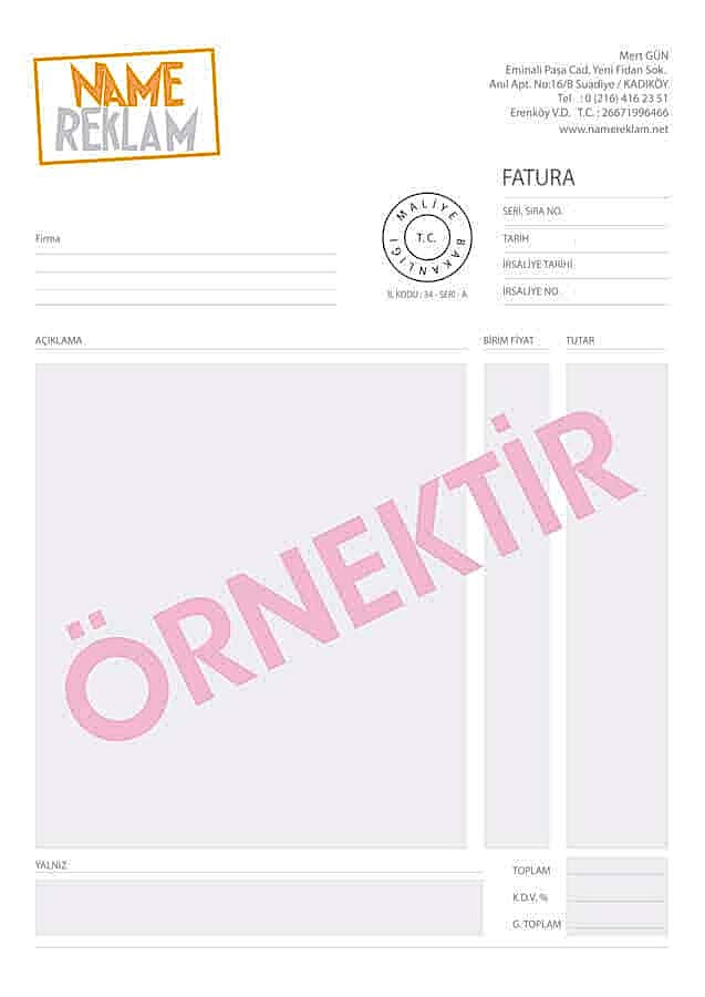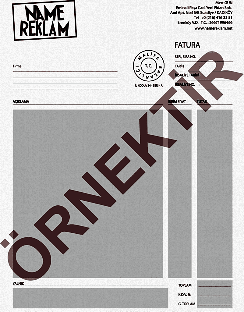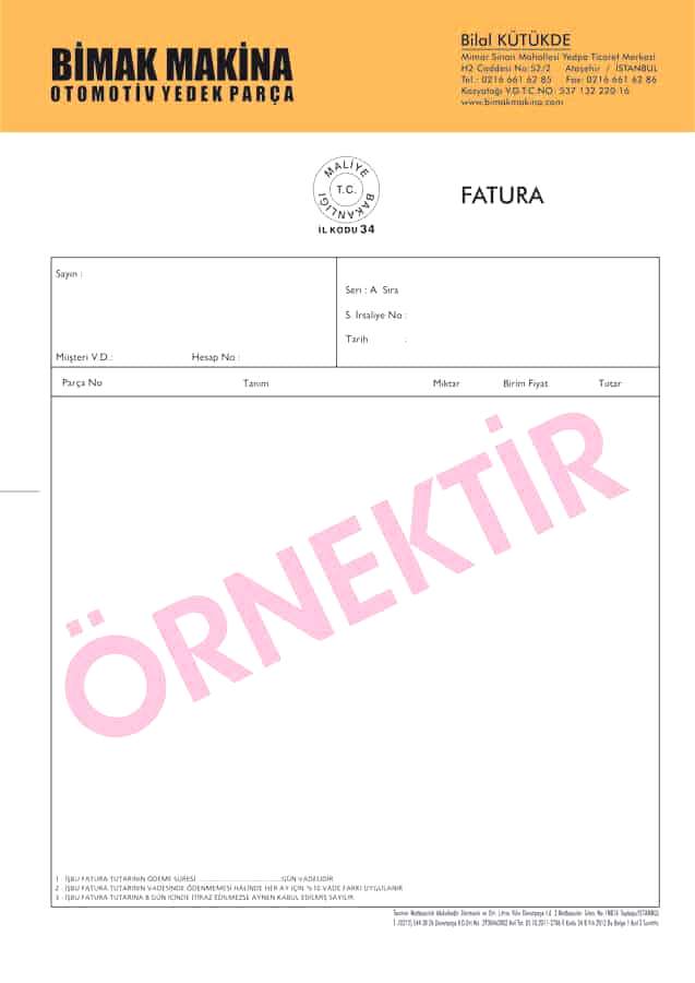 Sizlere en uygun fatura türünü seçerek kolaylıkla sipariş verebilirsiniz. Siparişinizi en kısa sürede üreterek tarafınıza teslim edeceğiz.