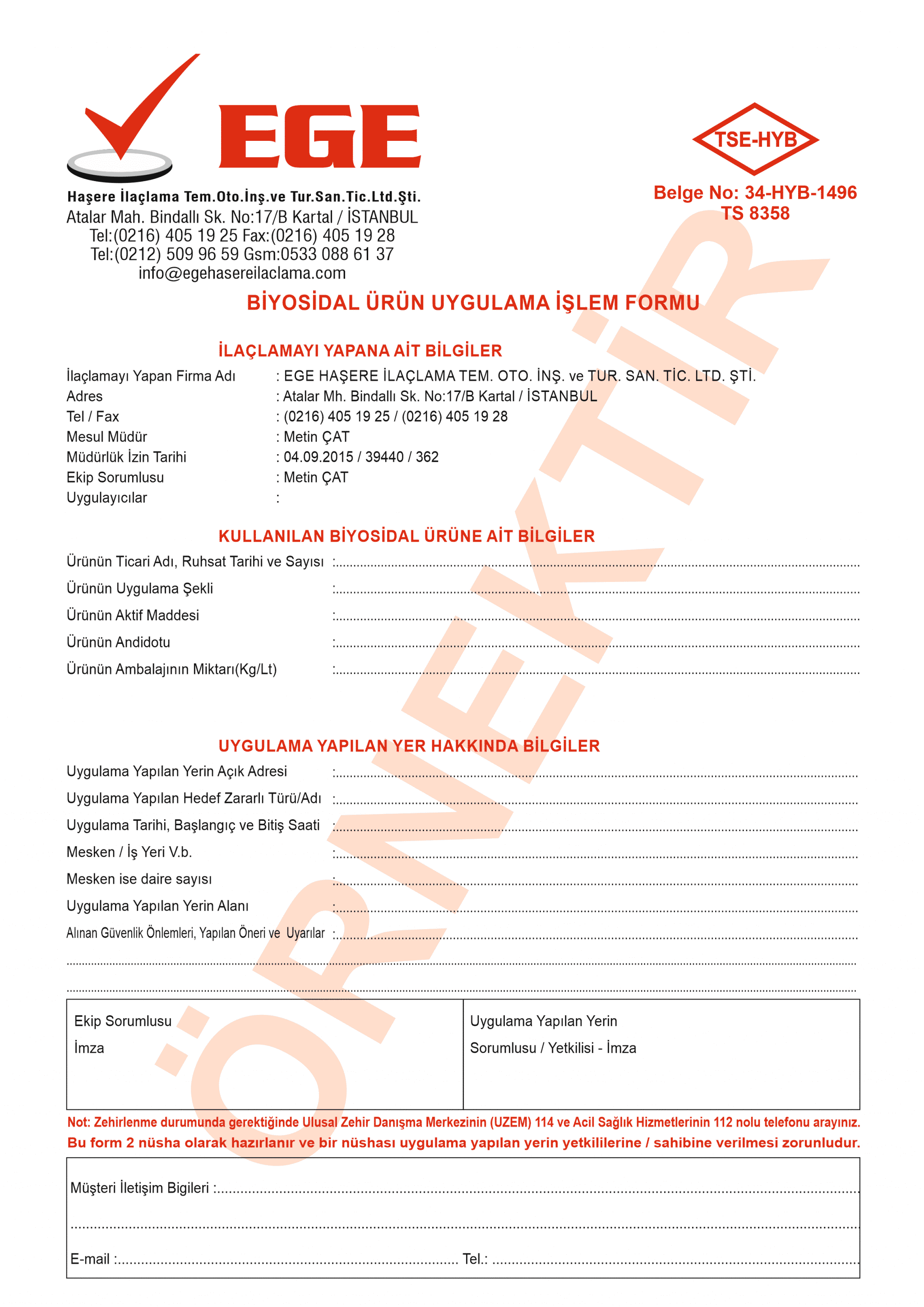 EGE İLAÇLAMA biyosidal ürün uygulama formu